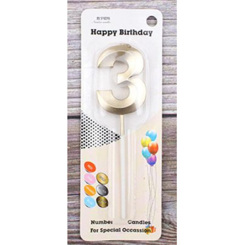 Свеча в торт "День Рождения" (шампань, на шпажке, металлик) цифра "3"